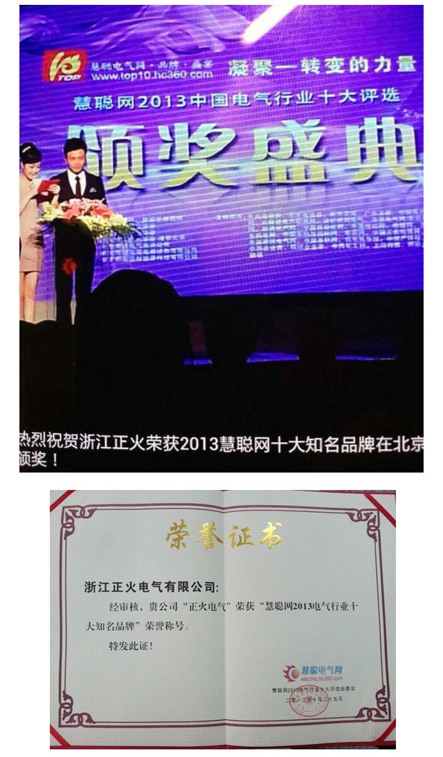 正火电气股份荣获“2013电气行业十大知名品牌”称号
