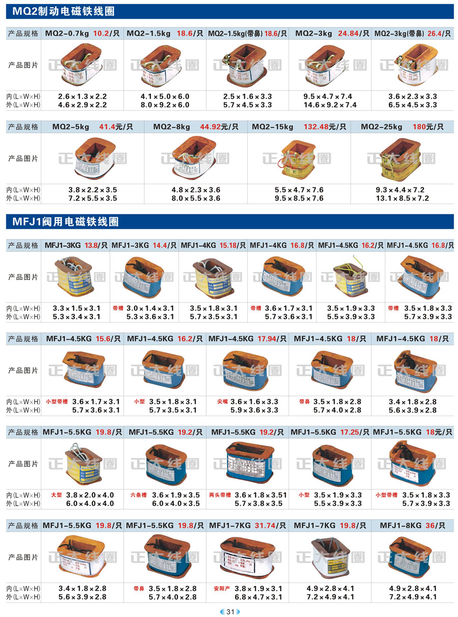 MZZ2、MZZ1直流电磁铁线圈、MZD1直推式电磁铁线圈、MFZ1制动电磁铁线圈、QJ2、QJ3补偿器、Q23、QZ610电磁阀、葫芦线圈 ↩