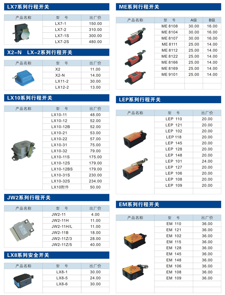 LX7、X2-N LX2、LX10、JW2、LX8、ME、LEP、EM系列行程开关